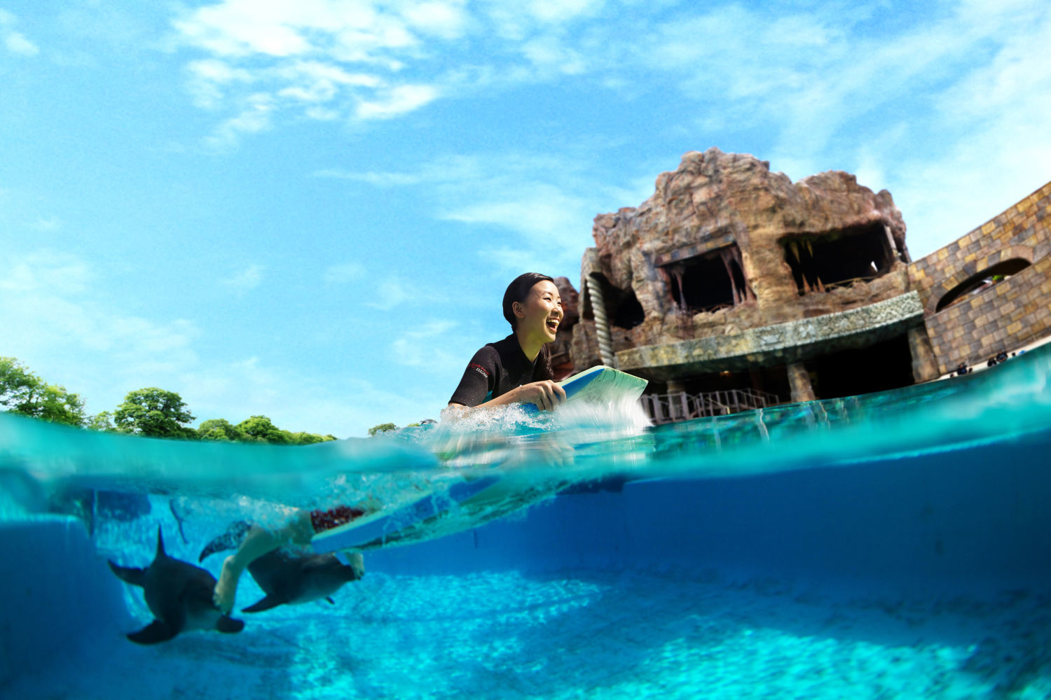 もっとイルカとふれあいたい人には、イルカと一緒に泳げる「ドルフィン・アドベンチャープログラム」もあります。水中からイルカが鼻先で足の裏を押してくれます。イルカのスピードで泳ぐ感覚は爽快!