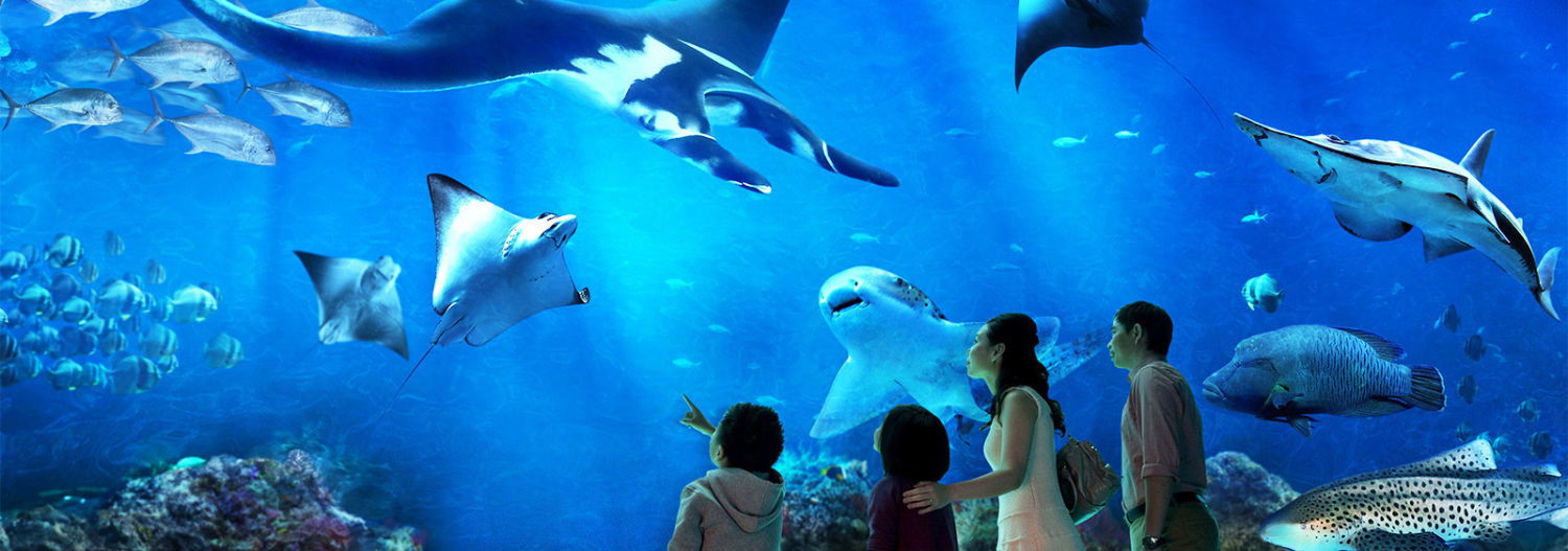 セントーサ島で一番人気は、世界最大級の水族館 シー・アクアリウムです。総水量は4280万リットル以上で、展示されている海洋生物は800種10万匹というから、おどろきですね。館内は全部で10ゾーンに分かれて、世界中の海をめぐる構成になっています。簡単に見どころをご紹介しましょう。