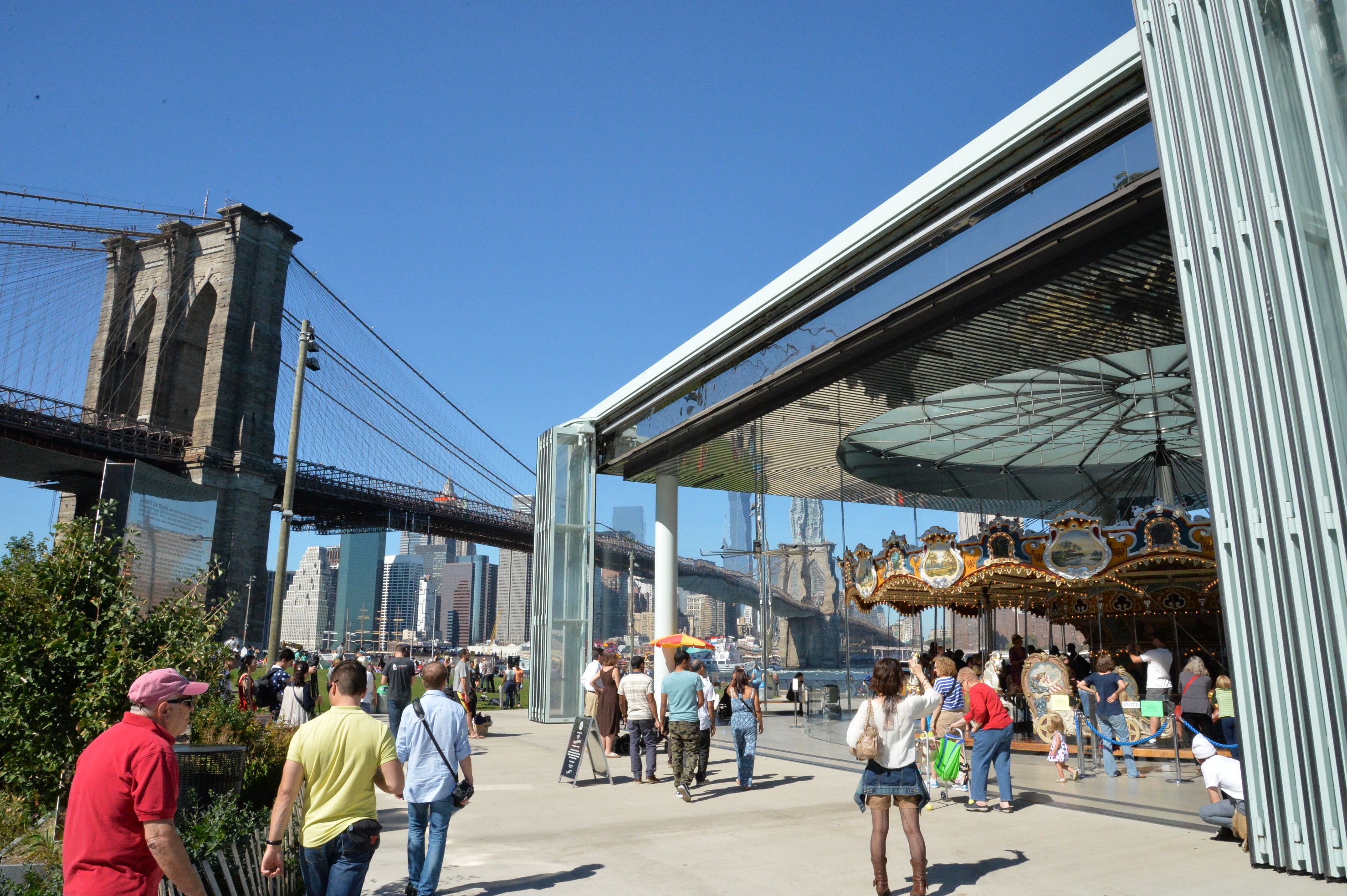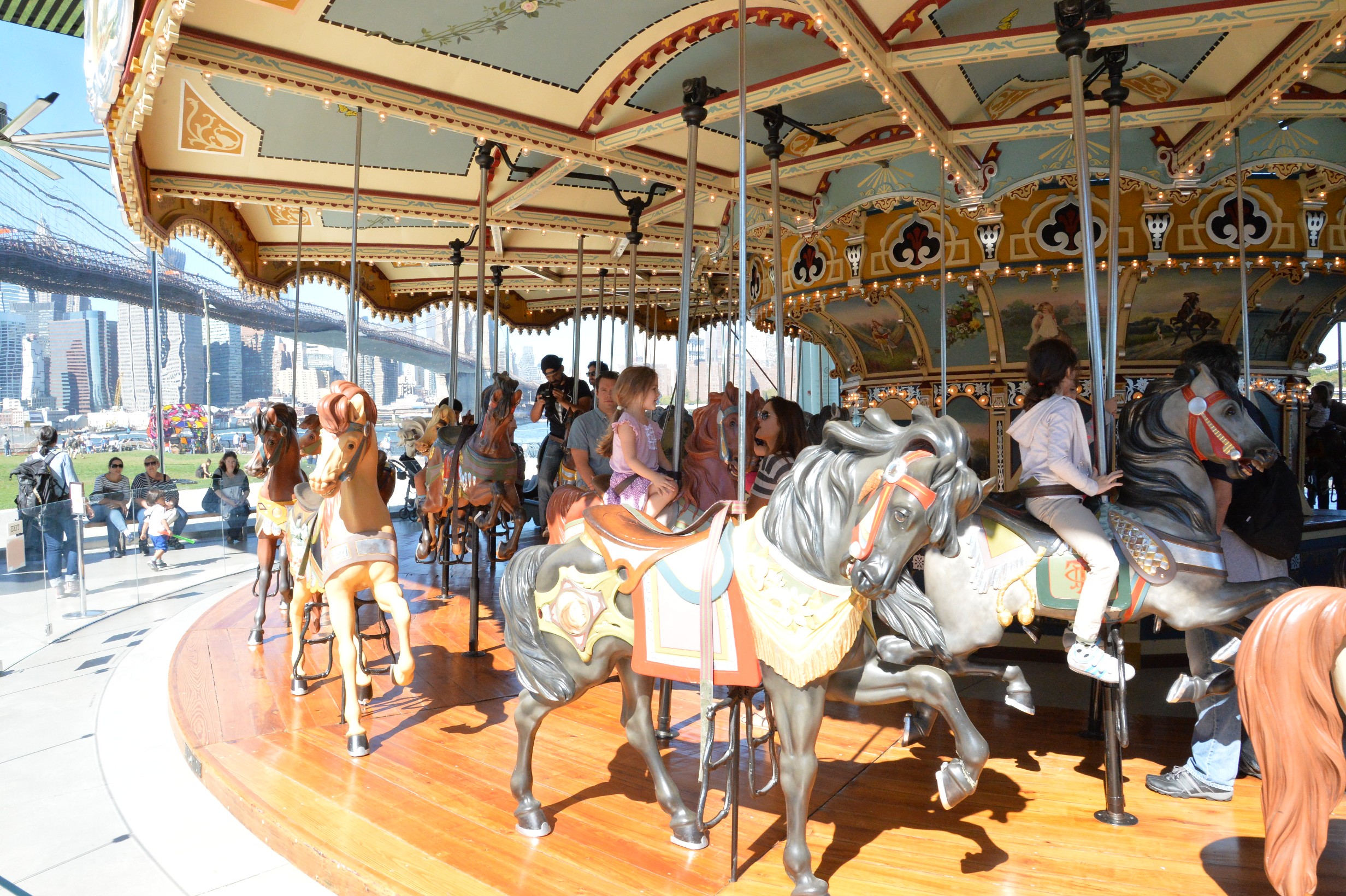ブルックリン ダンボ地区にある、ガラスの四角い建物にすっぽりと収まった、約100年前のヴィンテージカルーセル(回転木馬)です。ガラスの建物のおかげで、天候にも左右されず、誰でも楽しむことができます。