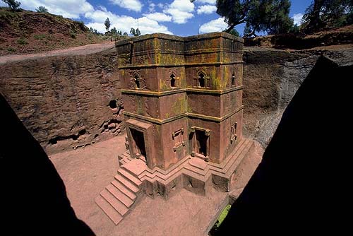 イスラム教国に囲まれたエチオピアでは、異教徒からの襲撃を防ぐために教会を隠すように建造してきたため、このようなつくりになったようです。