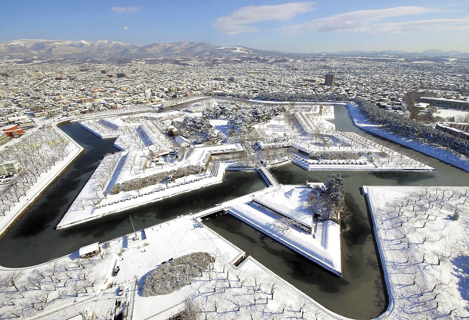 星型が特徴的な、北方防備の目的で造られた日本初のフランス築城方式の要塞。国の特別史跡に指定されています。幕軍と官軍の最期の戦いである箱館戦争の舞台としても有名です。冬期に行われるイルミネーションは、雪が降る大地に星が浮かび上がり、幻想的な雰囲気を醸し出します。