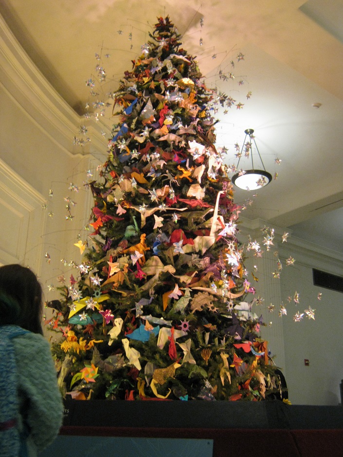 手作りの折り紙で作られたオーナメントが特徴のクリスマスツリー。オーナメントのモチーフは博物館内に展示されている展示物だとか …。