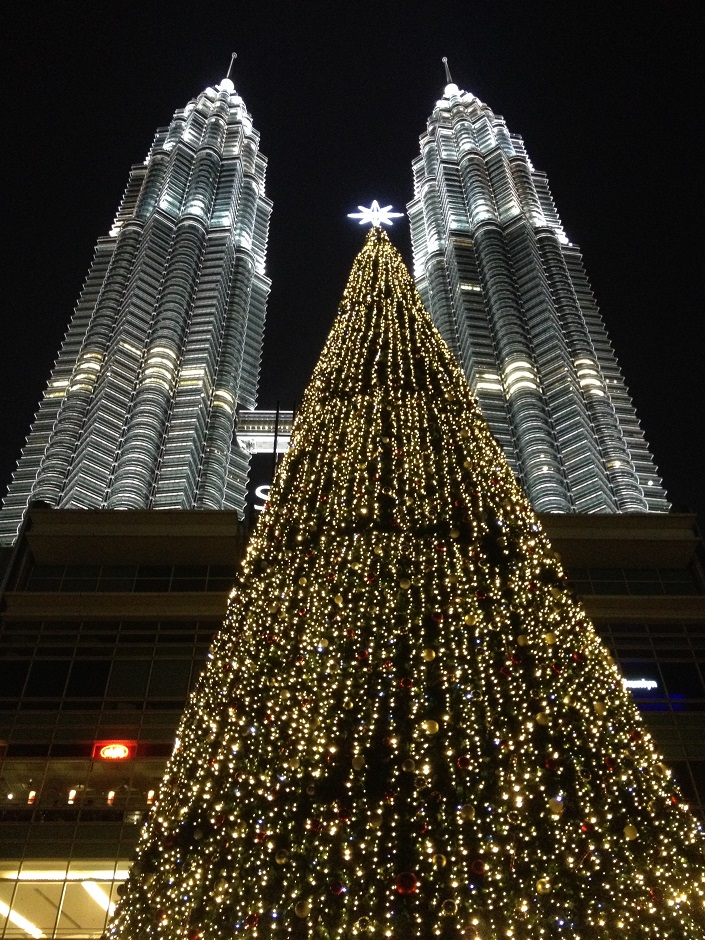 クアラルンプールのシンボル、「ペトロナスツインタワー」のすぐ下に、マレーシアで最も背の高いクリスマスツリーが飾られています。高さ32メートル、幅14メートルのクリスマスツリーは、大きなツインタワーの前でも存在感があり、 夜遅くまで観光客が絶えません。