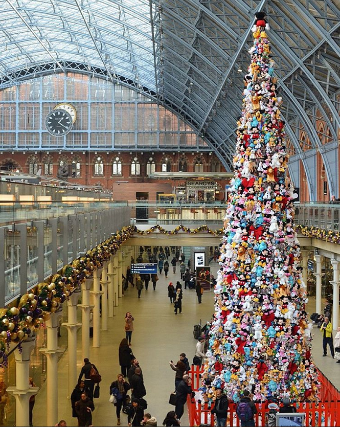 ユーロスターが発着するセント・パンクラス駅に登場したカラフルなクリスマスツリー。こちら、何で出来ているわかりますか?実は2000個のディズニーキャラクターのぬいぐるみで出来ています。とってもユニーク!