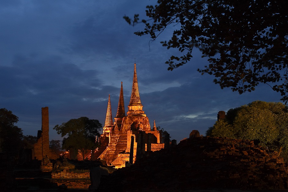 日中、アユタヤの歴史を静かに伝えるワット・プラ・シーサンペットの姿は荘厳ですが、日没後にはライトアップされ、闇夜に浮かび上がる仏塔もまた幻想的です。