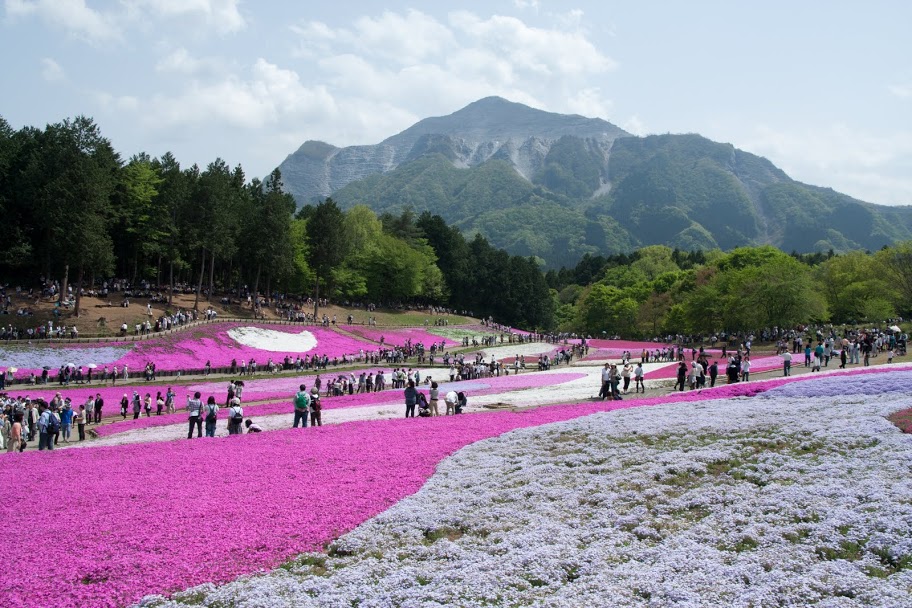 秩父のシンボルともいわれる武甲山の麓「羊山丘陵」の斜面を利用して、春になると約40万株の芝桜が咲き誇ります。色とりどりの芝桜がデザイン化され植栽されており、まるで花のパッチワークのよう!甘い香りの春風にそっとふかれてゆったりお散歩を楽しむことができます。