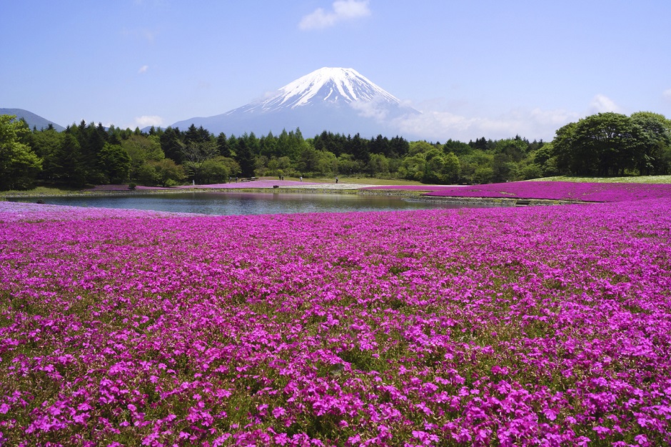 首都圏最大級の約80万株もの芝桜が富士山の麓、富士本栖湖リゾートに咲きます。頭に雪をかぶった富士山をバックに、紫、ピンク、白の美しい芝桜の絨毯が広がります。芝桜とはハナシノブ科の多年草で、フロックスの一種。直径1.5cm程の小さな花で、形が桜に似ており、芝生のように地面を覆って育つことから「芝桜」と呼ばれます。