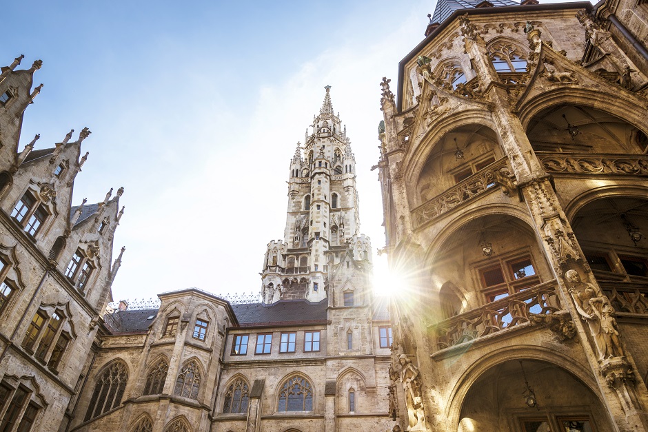 ミュンヘンは、新市庁舎のあるマリエン広場中心にレストランや店が建ち並び、活気あふれる街です。仔牛肉を使った、ミュンヘン名物白ソーセージとビールはぜひ味わって。