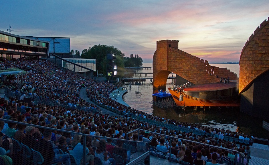 東西に細長い国オーストリア。その最西端に位置するブレゲンツは、ウィーンから列車で7時間ほどを要する町です。スイスとの間に横たわる湖「ボーデン湖」には特設ステージが設けられ、湖の上という立地を生かしたスペクタクルなオペラ公演を楽しむ事が出来ます。