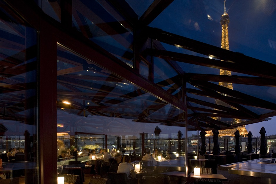 エッフェル塔のふもとにある「ケ・ブランリー美術館」、その最上階にある現代フランスレストラン「Les Ombres」。天井まで全面ガラス貼りでどの席からでもパリの光景を楽しめます。夏の時期はテラス席もあり、ここからのエッフェル塔の眺めはまた格別!エッフェル塔を眺めながらおいしい料理を堪能できる人気のレストランです。