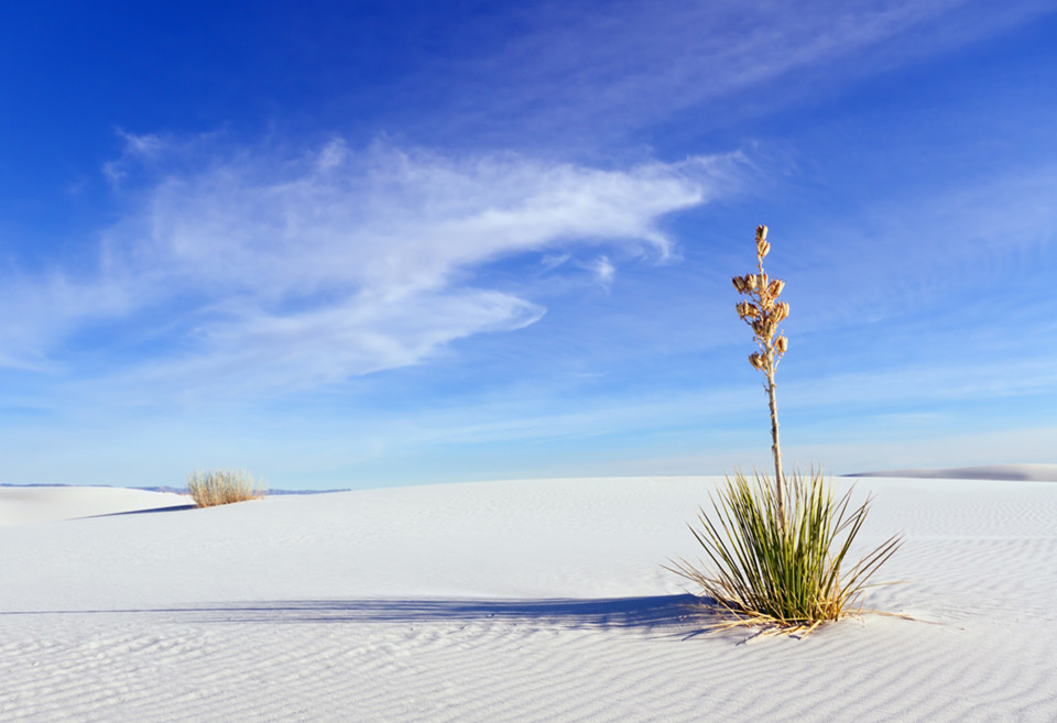 アメリカのニューメキシコ州の荒野に忽然と現れる純白の砂漠、それがホワイトサンズ国定公園です。東京の約4分の1程の面積を誇ります。この砂漠の白い砂はアラバスターという雪花石膏で、水溶性のため、通常は雨などで川から海へと流れていき留まることはありません。しかしこの一帯には川がないため雨や雪解け水によって溶かし出された石膏などの鉱物が平地を覆うように溜まり、乾燥して結晶となりました。その結晶が長い年月をかけて風化し、浸食され、砂状に砕かれて現在の白砂漠を形成するに至ったのです。