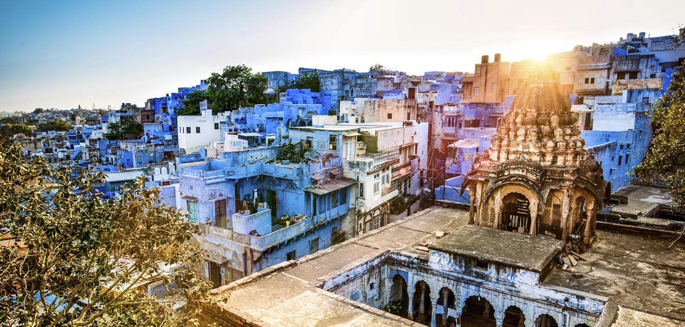 ブルーシティと呼ばれるインドの青い街、ジョードプル。タール砂漠の入り口に位置し、長さ10kmもの城壁に囲まれた城塞都市です。家々の壁は青く塗られていて、青い街として有名なモロッコのシャウエンに似ています。もともとは壁に塗った害虫駆除効果のある化学染料がライム色だったのですが、それが青く変色してしまったという説や、階級を識別する為といった説があるようです。