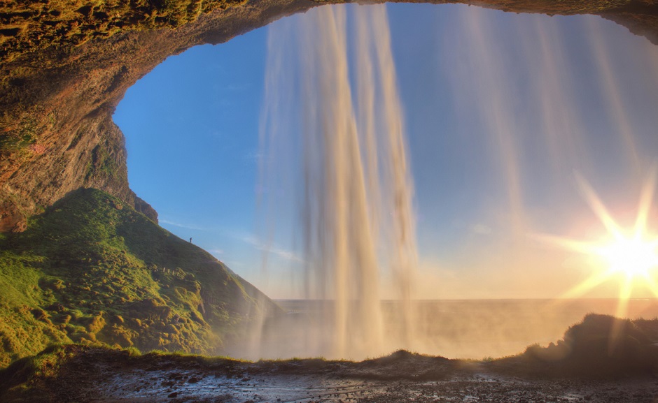 アイスランド南部のリングロード(国道1号線)近くにある滝、セリャラントスフォス。滝壺の壁側がくりぬかれたような形になっている為、滝の裏に回ることができます。青い空を背景に流れる滝を見ることができる人気の場所です。特に春には緑の大地に可愛らしい花が咲き、絶景が広がります。夕方には夕陽に照らされたピンク色の滝が見られます。そしてアイスランドといえばオーロラが観測できる事でも有名。運がよければオーロラと滝を同時に楽しむ事もできます。
