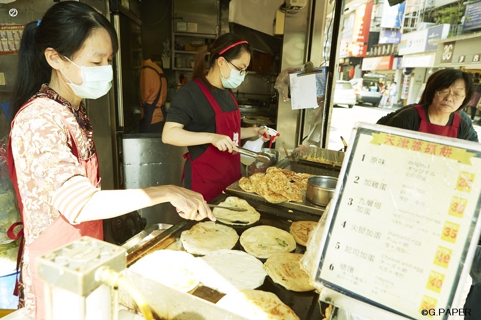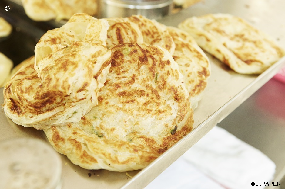②③一日目の士林市場でも食べた蔥油餅(ツォンコーピン)。ちょい辛タレとタマネギの甘みがやみつきに。