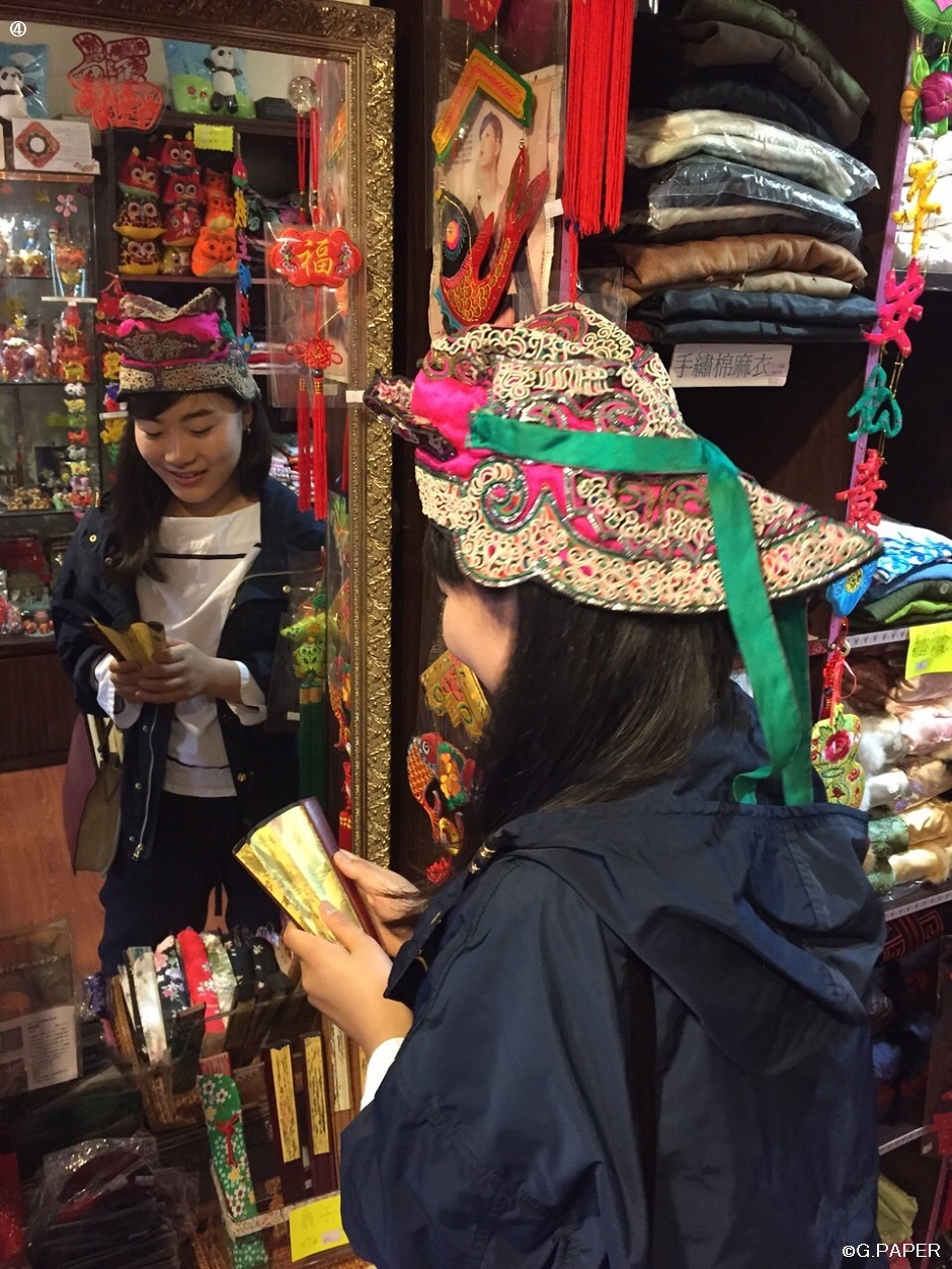 ④少数民族の服やチャイナドレス、雑貨を扱う店。正月に被るための帽子を試着中。
