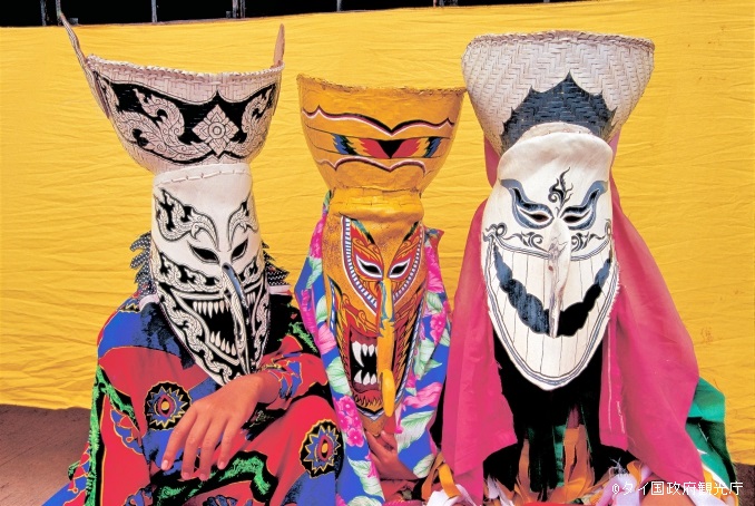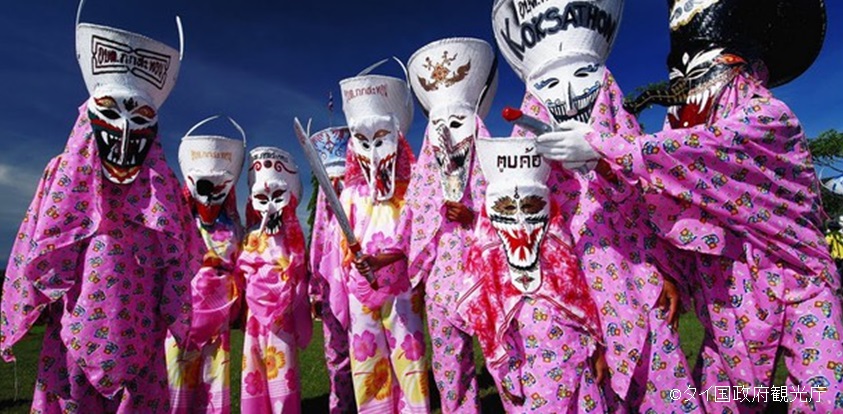 村人達が“精霊”として、ココナッツの樹木で作られた奇妙な仮面とカラフルな衣装を身にまとい、さらに木彫や細長い刀を手に持って、街中を練り歩く姿は圧巻です!あなたも精霊となって祭りに飛び込み、リズムにのって地元の人と行進しながらタイの神々や大地に感謝を捧げてみませんか?