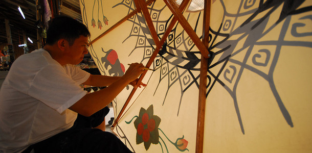 チェンマイ・ボーサーン村の傘は、村の修行僧が隣接するビルマへ赴いたときに、その生産方法を学習し村人に伝授したと伝えられたものです。やがてボーサーン村ではどの家も唐傘をつくるようになり、今ではチェンマイを代表する伝統工芸品として人気があります。