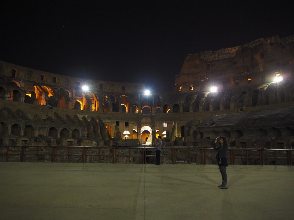 そんな中、やってきました夜のコロッセオ。限られた人数のツアー参加者のみが、中へ入ることができます。この特別感に、見学前からドキドキします。さて、さっそく幻想的な姿を見せる夜のコロッセオに入場します。