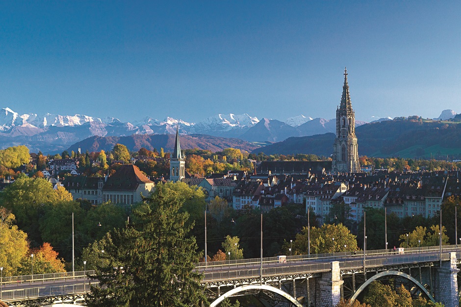ヨーロッパの旧市街では珍しく、中世の家並みと川、そして遠方にはアルプスを望めるという、特別な景色がベルンの特徴です。