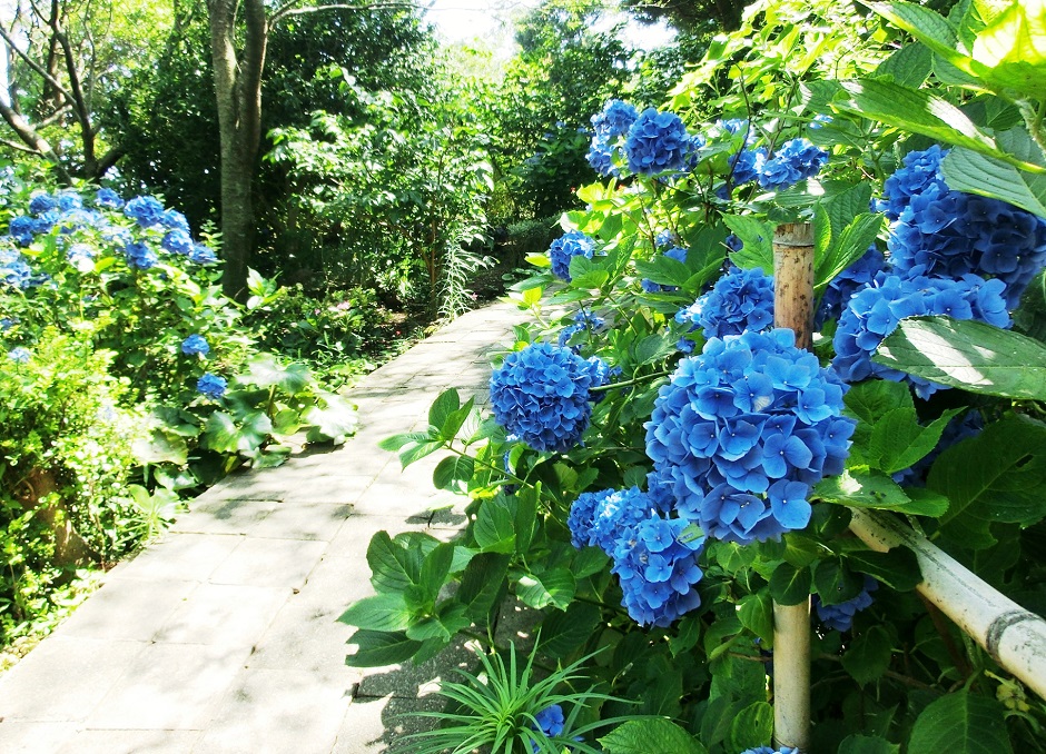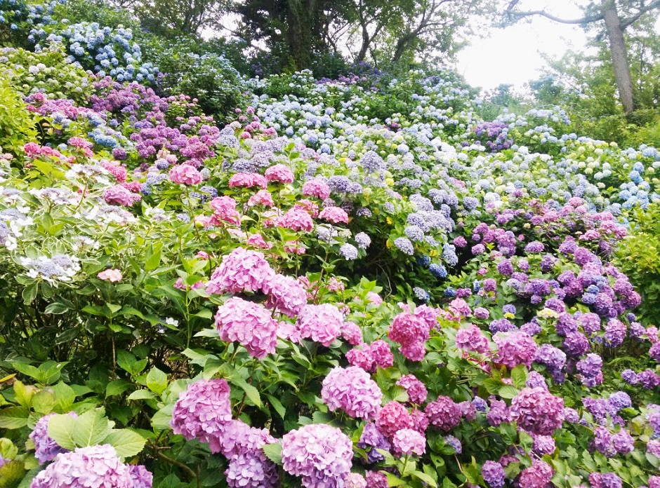 株数は日本一とも言われ、100種類以上のあじさいを見ることができます。小高い丘にある公園内の遊歩道や斜面にも大輪の花が咲き、その様子は圧巻の一言です。見ごろは6月上旬~6月下旬です。