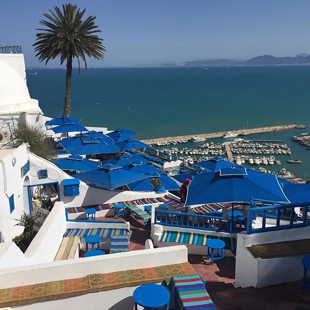 「 チュニジア・チュニス近郊のシディ・ブ・サイド 白い壁と青の窓枠の街。青は蚊が嫌いな色で、蚊除け効果があるとのこと。」