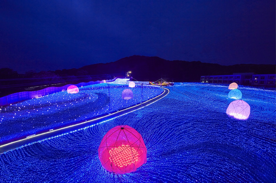 まるで広大な宇宙のような世界が広がる「光の丘」(2016年9月30日まで)。散歩道を歩くとブルーに広がるイルミネーションに包まれ、そこはもう別世界です。高台の展望台からは、光の丘を一望でき、地上とはまた違った光景を楽しむことができます。