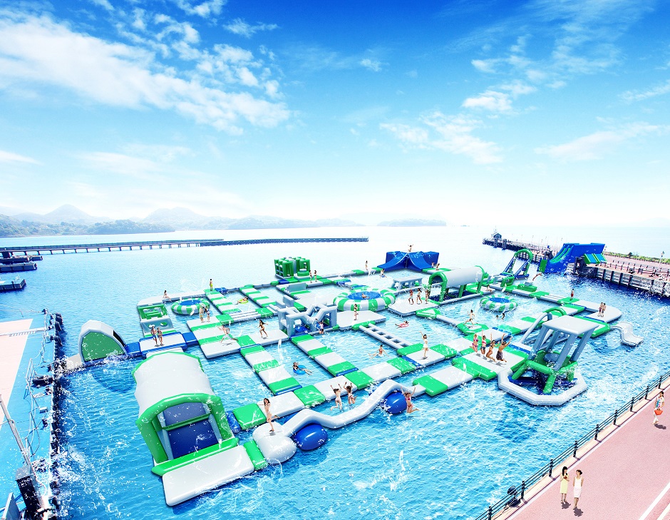 巨大な約60個のアイテムが組み合わさった海上アトラクションが初登場!ミッションクリアを目指して海の上で飛び跳ねましょう!