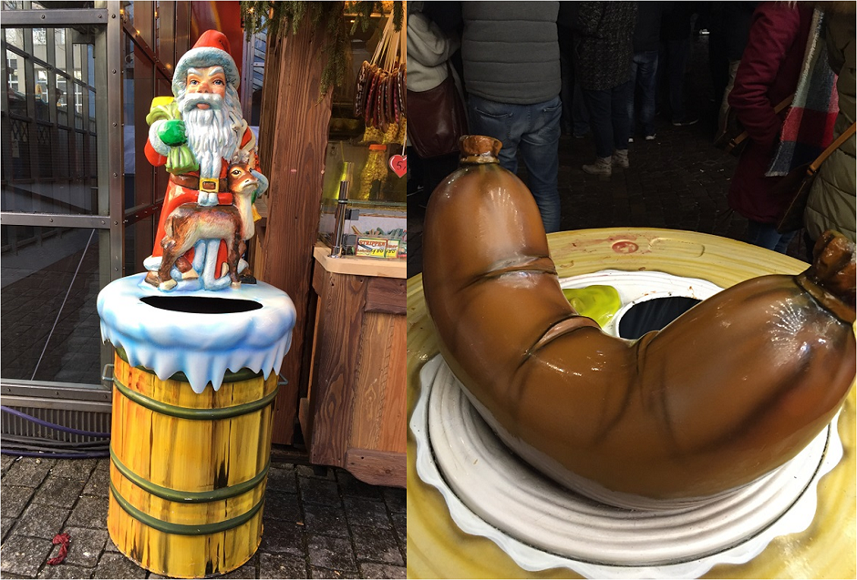 これ…可愛らしいサンタさんや巨大ソーセージ?かと思いきやゴミ箱なんです!