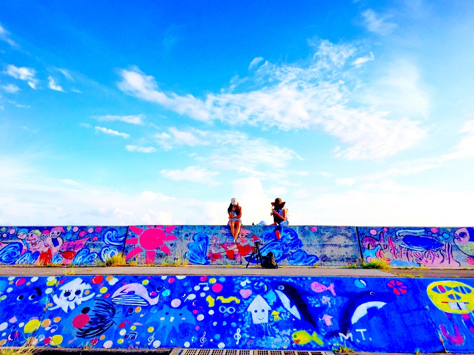 子どもたちが海沿いの塀に書いたカラフルな壁画アートと、青々しい空をバックにオシャレな写真を撮ったら…