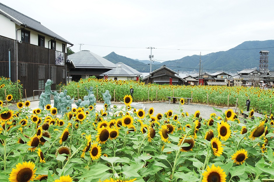 【2】島内にある映画と文学のテーマパーク「二十四の瞳映画村」は、昭和初期の小さな村を再現しており、懐かしい揚げパンなどの給食セットも召し上がれます!夏にはひまわりが一面に!!