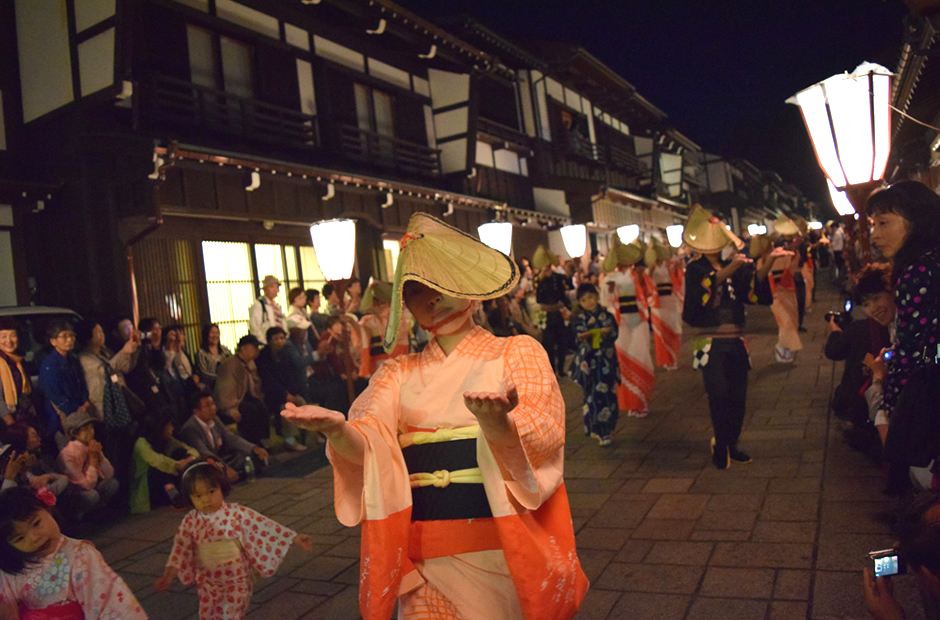 ボンボリがともる風情ある町で、三味線と胡弓(こきゅう)の音色に合わせて、叙情豊かにしっとりと優美に舞う踊りは人々を魅了します。