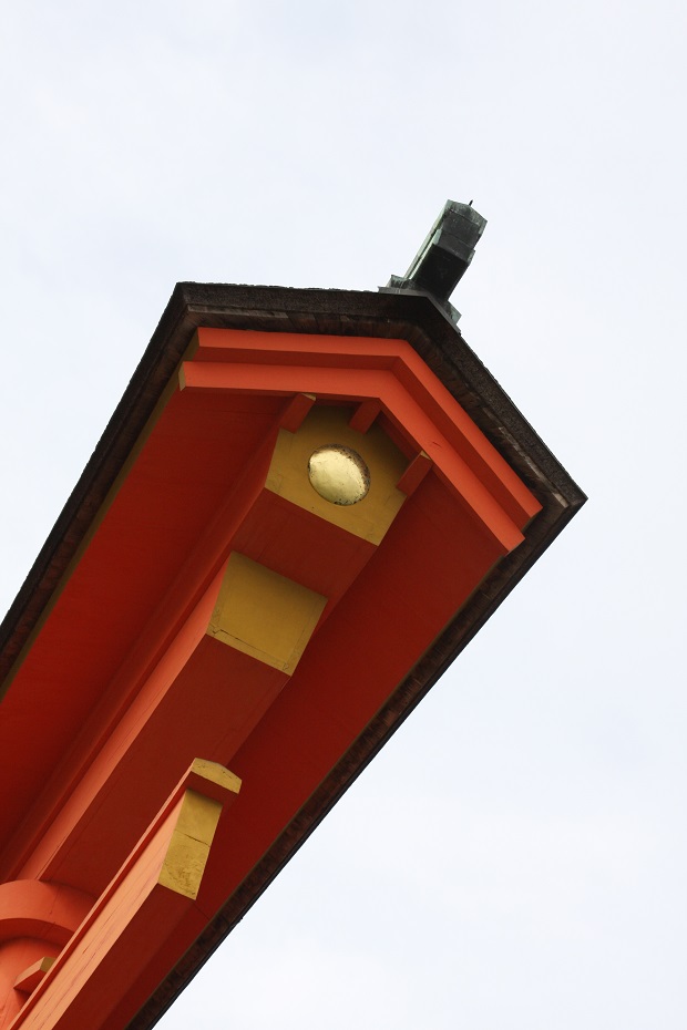 大鳥居の朱色と空の青、山や海の緑のコントラストがとても素晴らしいですね。