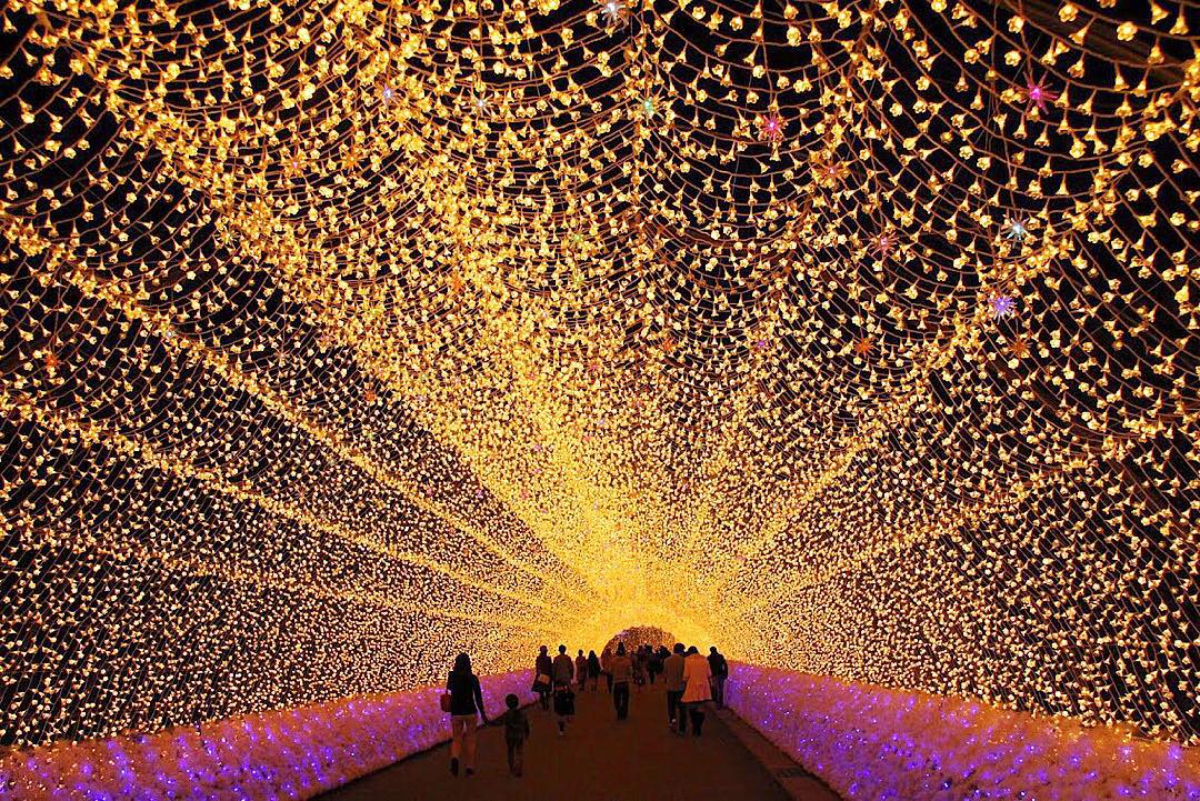 いまや冬の風物詩ともいうべき、なばなの里の「光のトンネル」。どこまでも続く輝きのトンネル可愛い花びらを模った電球が照らす暖かなあかり。全長約200mの光の回廊は必見!