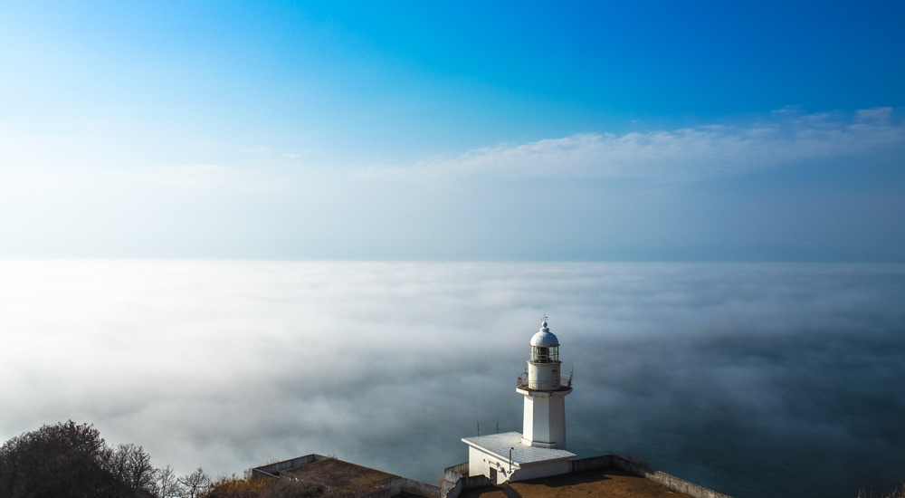 この岬では年に数回、海面をはうような海霧が真正面から迫ってきます。目の前一面が雲海に覆われ、幻想的な雰囲気に包まれます。海から反対を向くと、室蘭の街に流れこむ海霧を見る事もできます。