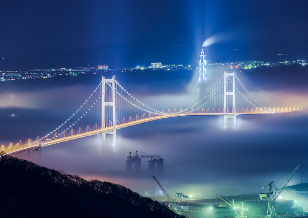 ここでは噴火湾、太平洋で発生した海霧が室蘭港へ流れ込む雲海が見られます。タイミングが良ければ360度の雲海になることも!白鳥大橋や工場群が霧に包まれる様子は圧巻です。
