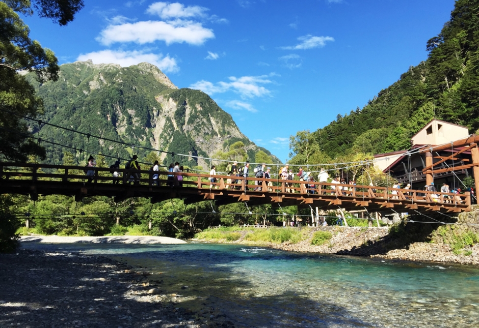 年間150万人もの人々が訪れ賑わいをみせる山岳リゾートで、シンボル的存在の橋です。橋上から望む3,000m級を誇る穂高連峰や焼岳、梓川の水面の風景は、訪れる人の心をとらえてやみません。