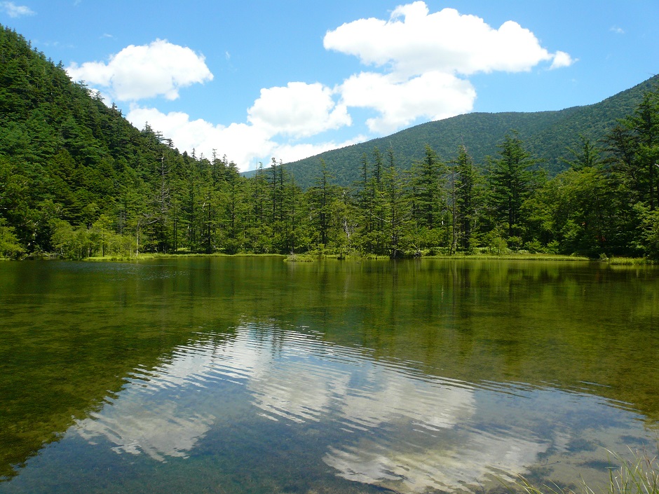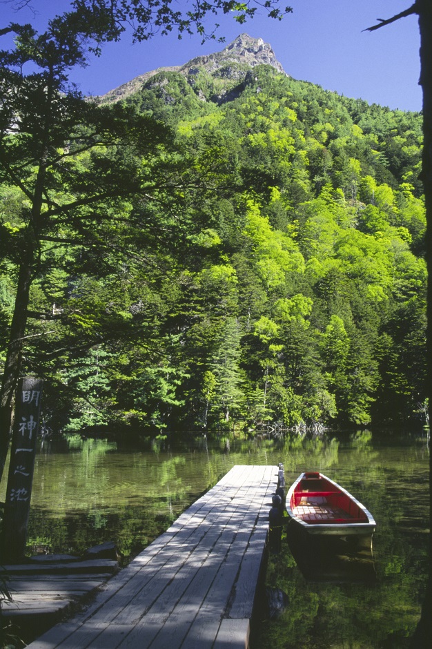 明神池は「一之池」と「二之池」、大小2つからなるひょうたん型の上高地にある池。池畔に穂高神社奥宮が鎮座する神域で、心が洗われるようなパワースポットです。