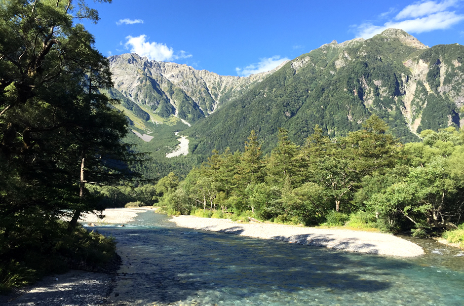 上高地の中心にあり、シンボル的存在の河童橋。橋の上から望む穂高連峰や焼岳、梓川の水面、緑に萌えるケショウヤナギの風景は、訪れる人の心をとらえてやみません。