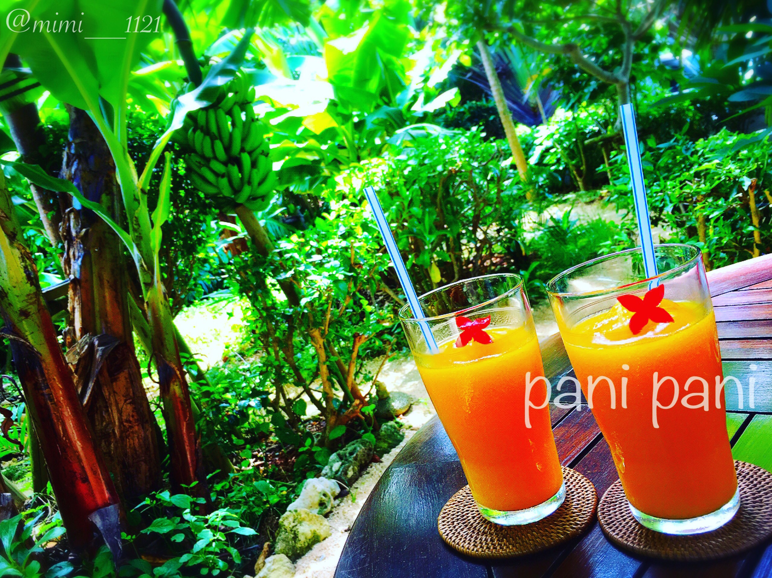 来間島にあるカフェpanipani♡お店は室内ではないので、とても開放的です!足元には一面砂浜になっていてbeach気分になれちゃいます!奥には緑がたくさんあり、バナナの木や、