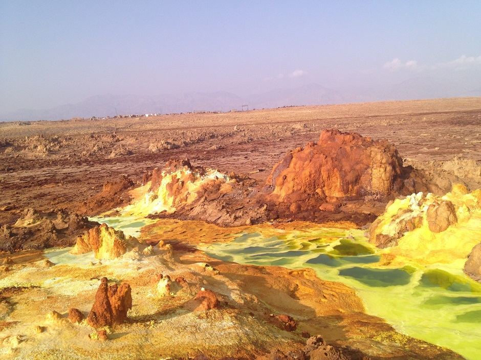標高は海抜以下で、現在でも火山活動が非常に活発な地熱地帯です。熱された様々なミネラルを含んだ塩水が噴出することによってできた、想像もつかない極彩色の絶景が広がるダロール山、地中から熱せられた硫黄などの鉱物が噴き出す温泉地帯、どこまでも広がる塩でできたアサレ湖。