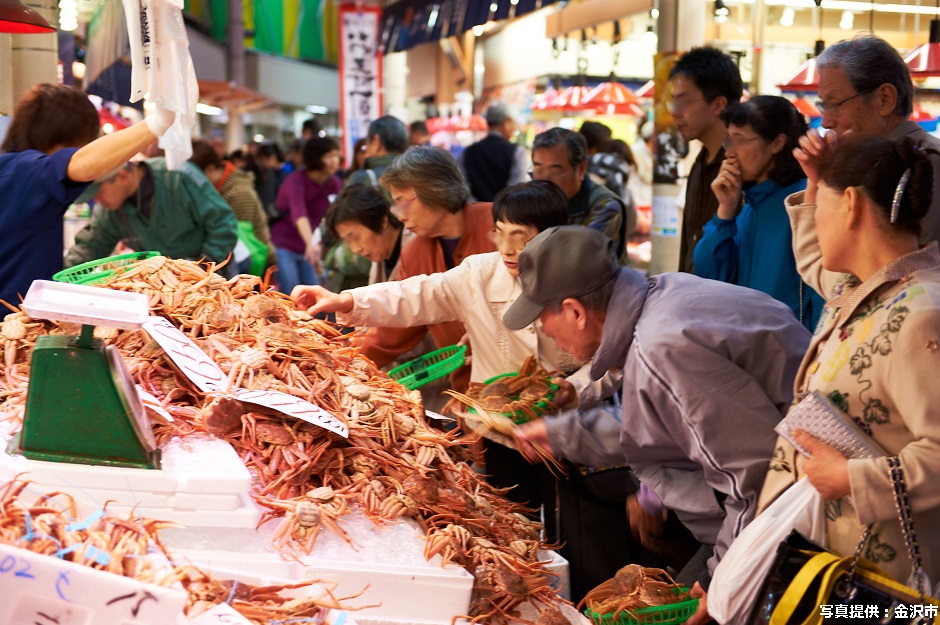 約180もの店が軒を連ねる「近江町市場」では、日本海の新鮮魚介類を使ったお寿司や旬な加賀野菜を使った美味しいご飯が食べられます。活気のある市場を散策するのも魅力のひとつ。きっと素敵なお土産も見つけられるはず…