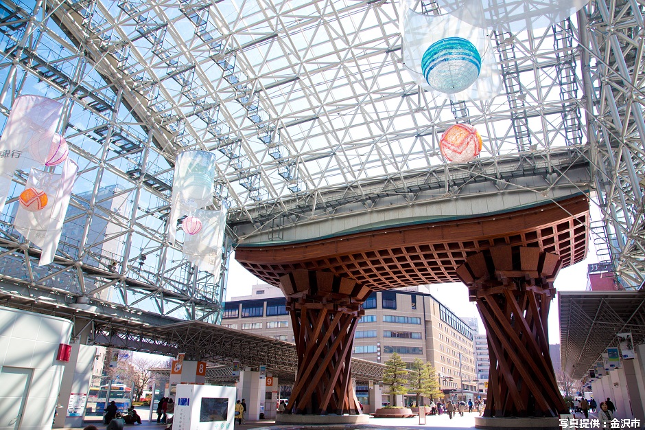 この駅は、日本で唯一「世界で最も美しい駅14選」(※アメリカの旅行雑誌「トラベル・レジャー」調べ)にも選出された駅でもあり、金沢に到着してまず観光するスポット!また、雨傘をイメージしたガラスのドーム「もてなしドーム」にて構成された駅舎は金沢に観光に訪れた人々をおもてなしする心にあふれています。