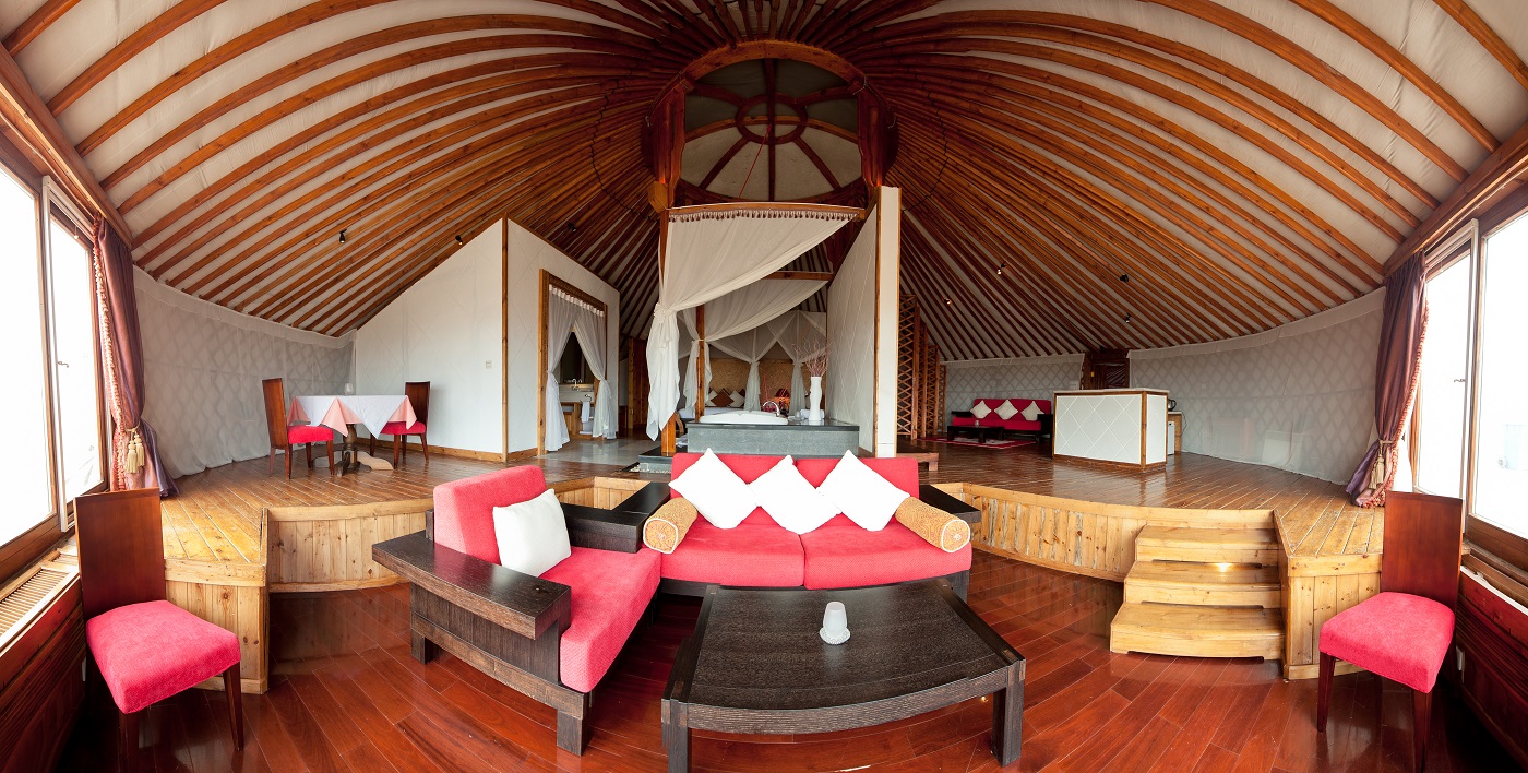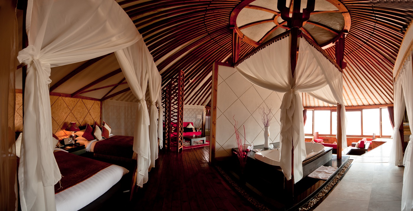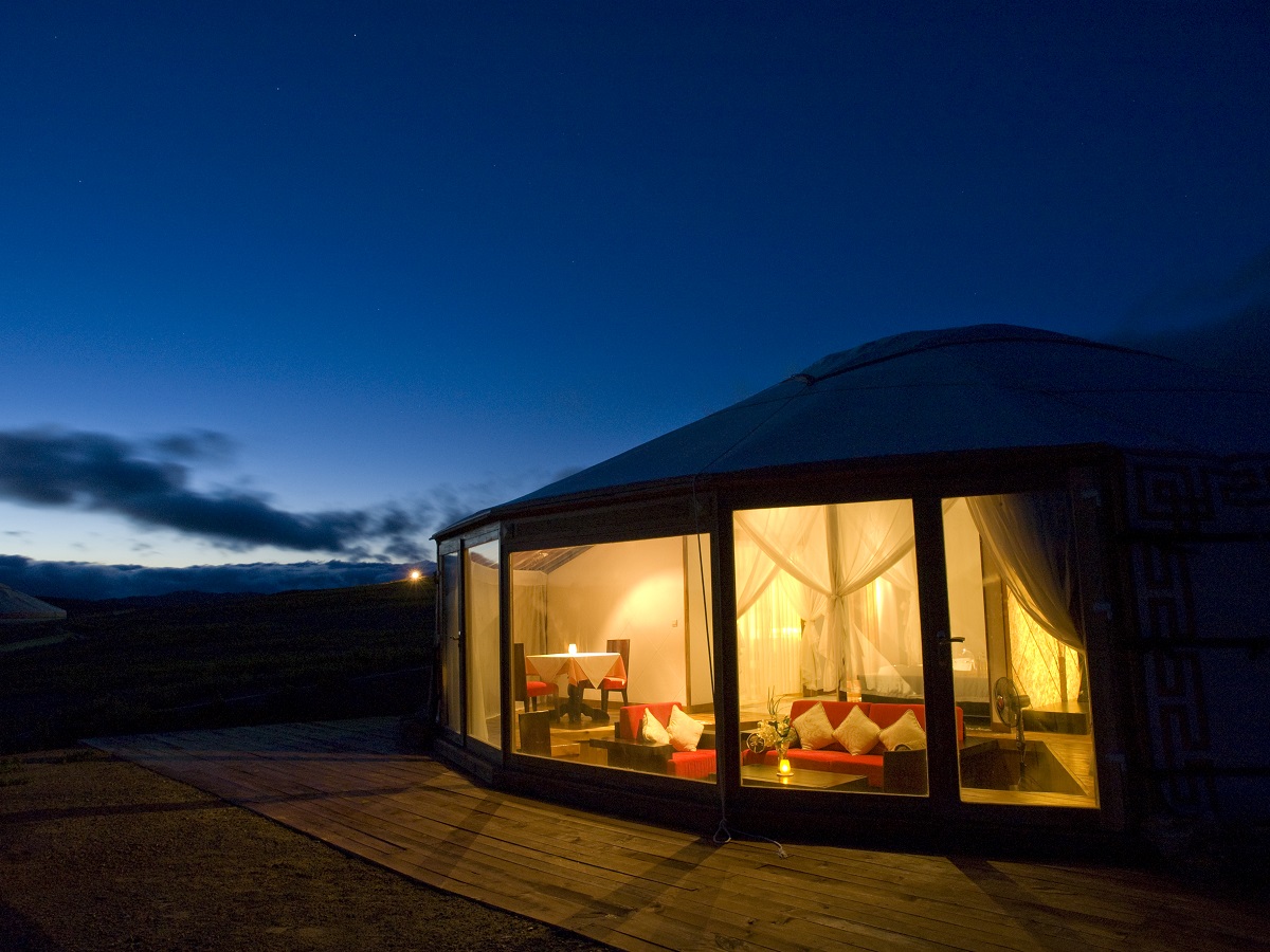 ゲルをモチーフに、1棟独立型ヴィラタイプの客室には大きな窓があり、くつろぎながら大草原を楽しむことができます。