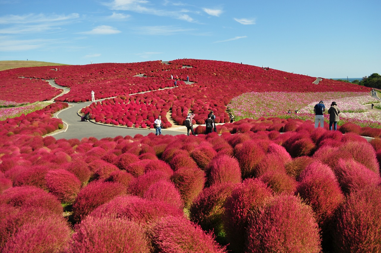 敷地面積200haと広大で、四季折々に咲き誇る花々を楽しむ事ができます。初夏に青の花を咲かせるネモフィラと並んで、特に人気なのがコキア(ほうき草)です。約3.5haの“みはらしの丘”をコキアが真っ赤に染め上げます。8月・9月には緑色をしたコキアが、秋の訪れと共に真っ赤に色づくのです。ふわふわ、もこもこした形がなんとも愛らしい景色が広がります。2016年は9月17日~10月23日の期間に「きてみてさわってコキアカーニバル」が開催され、10月2日と23日には入園料が無料になります。