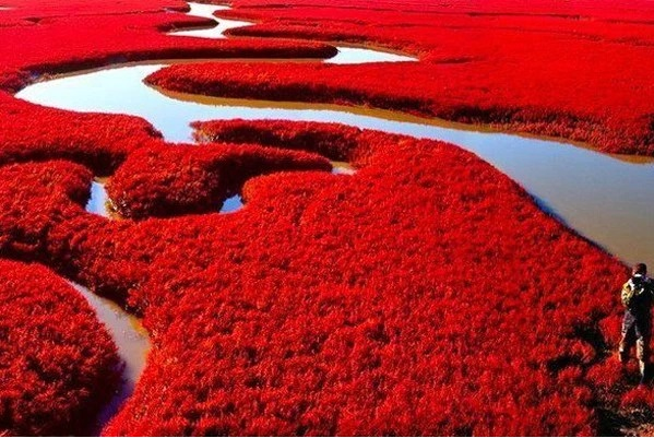 中国の北東部、遼寧省(りょうねいしょう)にある湿地帯は、総面積100平方kmと広大な面積を誇り、その見た目から「レッドビーチ」や「紅海灘風景区」と呼ばれ、秋になると真っ赤に染まります。理由は、夏には緑色をしているマツナと呼ばれる海藻の一種が、秋になるとアルカリ性の土壌の成分に反応し赤く染まるのです。多くの生物が生息しており、レッドビーチのほとんどは自然保護区に指定されています。