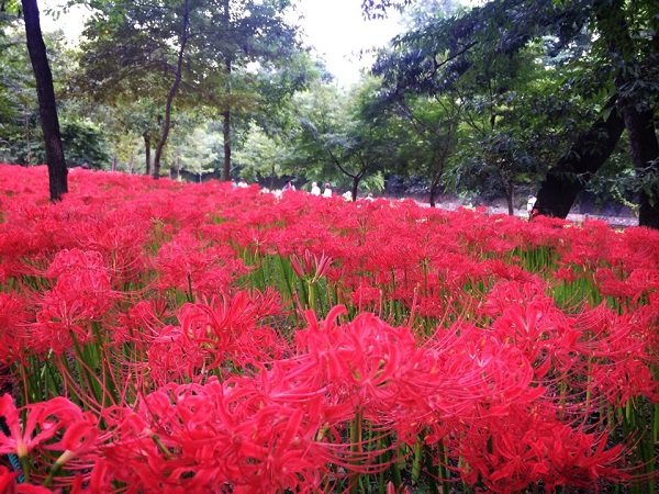 埼玉県日高市の西部、高麗川(こまがわ)に囲まれたところにある、まるで巾着のような形をした平地を「巾着田」といい、毎年9月~10月になると、高麗川沿いの河川敷に、約500万本もの真っ赤な曼珠沙華(=彼岸花)が咲き誇ります。開花時期にあわせ、「曼珠沙華まつり」も開催され(2016年は9月17日~10月2日予定)、多くの観光客が一面に広がる赤いじゅうたんを見に訪れます。