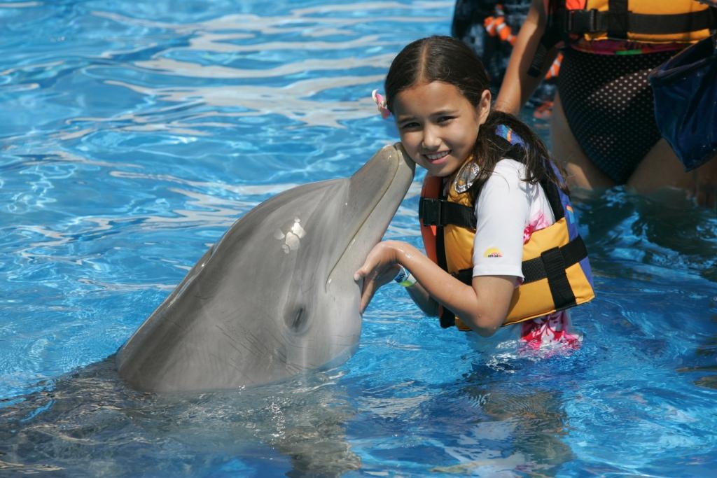 アザラシやペンギンの曲芸が楽しめる人気絶頂のテーマパーク「シーライフ・パーク・ハワイ」内の海水プールで、夢のイルカと一緒にスイミング!!ポーズをとって仲良く記念撮影したり、イルカたちから歓迎のキスも…!!