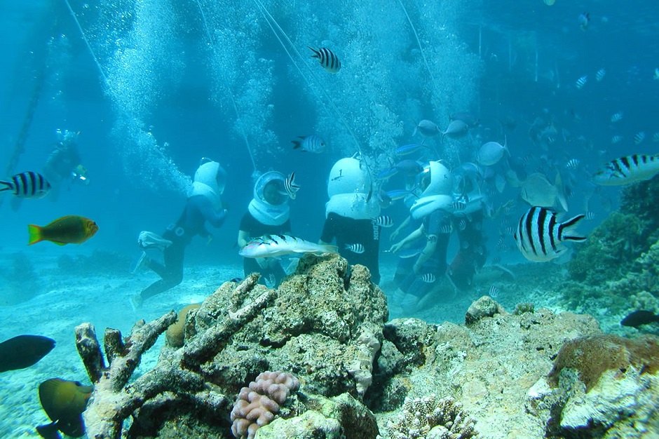 7つのマリンスポーツの中でもお勧めは、頭と肩をすっぽり包む特殊な海中ヘルメットをかぶり、水中に潜るのが、シーウォーカー!