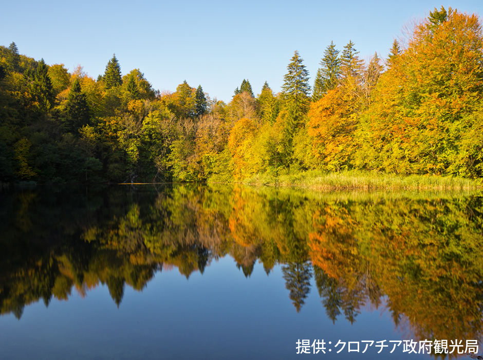 石灰華(石灰質堆積物)の働きで造られたこの湖群は、日光の角度により水の色がエメラルドグリーンやコバルトブルーに変化します。10月中旬から下旬には、黄色、オレンジ、赤と木々が見事に色づき、ブルーの水の色との美しいコントラストを楽しむ事ができます。