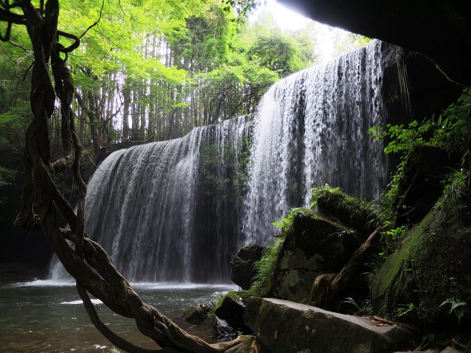 阿蘇(あそ)地域の北に位置する小国郷(おぐにごう)には、自然にできた水のカーテンが美しい「鍋ヶ滝(なべがたき)」があります。